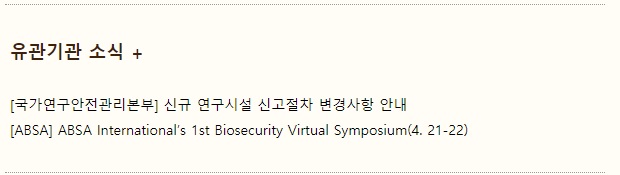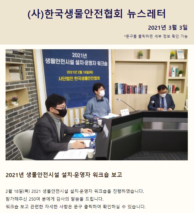 뉴스레터 (2021.03) 작성자 홈페이지 관리자 조회 1,591 작성일 2021-06-09 한국생물안전협회는 협회 소식과 생물안전 관련 정보를 담은 뉴스레터를 격월로 발송하고 있습니다. 뉴스레터 수신을 원하시는 경우 협회 메일(kobsa@hanmail.net)로 문의 바랍니다. 이전글 다음글 목록