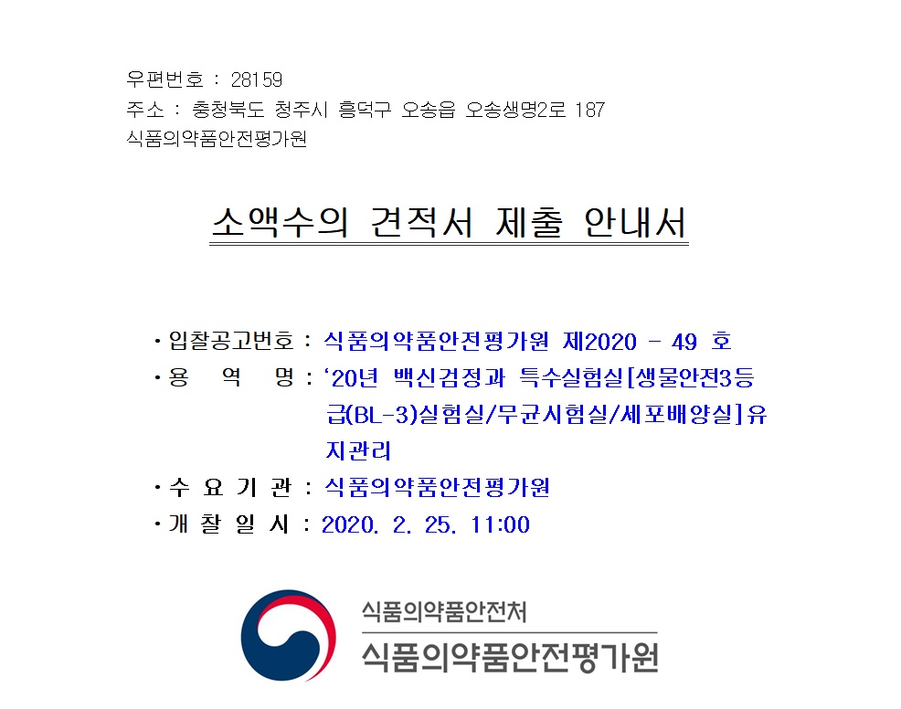 "2020년 백신검정과 특수실험실[생물안전3등급(BL-3)실험실/무균실험실/세포배양실] 유지관리" 공고를 안내드립니다.