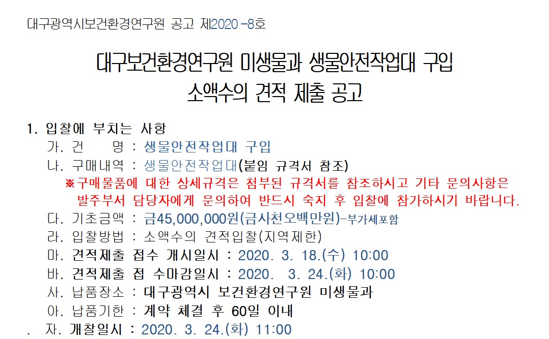 [나라장터] 대구보건환경연구원 생물안전작업대 구입 소액수의 견적 입찰공고 (2020.03.18-2020.03.24) 작성자 최고관리자 조회 341 작성일 2020-03-18 안녕하세요. 한국생물안전협회입니다. 대구광역시보건환경연구원 공고 20200332295-00 생물안전작업대 구입 소액수의 견적 입찰공고를 안내드립니다. 감사합니다. 이전글 다음글 목록