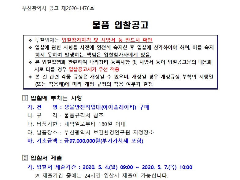 [나라장터] 생물안전작업대(아이솔레이터) 구매 (5.4~5.7) 작성자 최고관리자 조회 241 작성일 2020-04-29 안녕하세요. 한국생물안전협회입니다. 부산광역시 공고 제2020-1476호 생물안전작업대(아이솔레이터) 구매 공고를 안내드립니다. 감사합니다. (나라장터 바로가기) 이전글 다음글 목록
