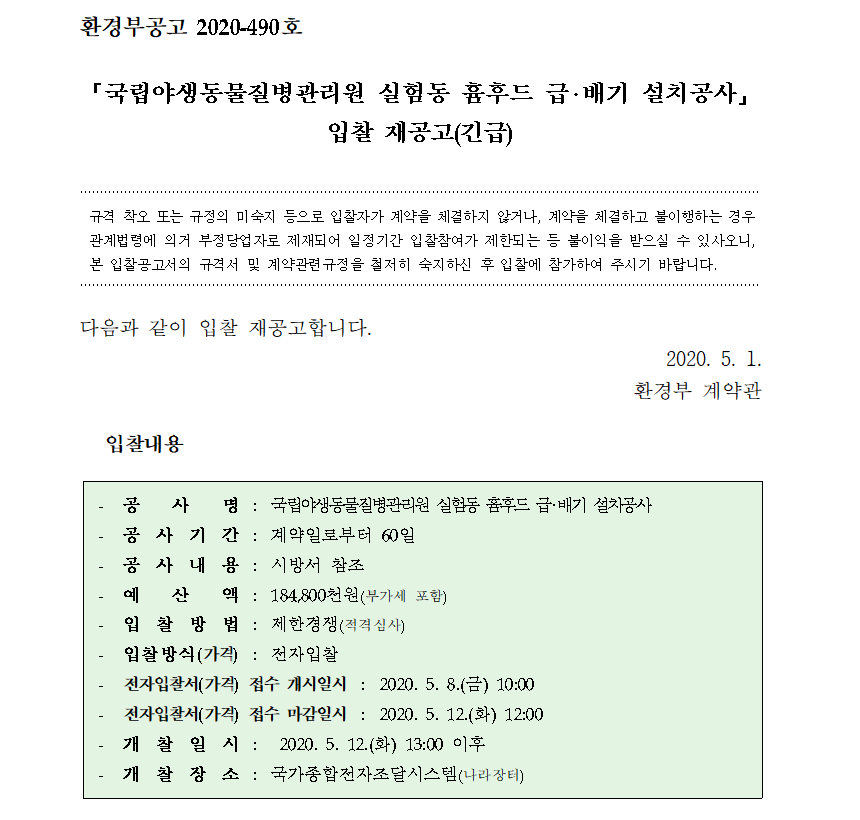 [나라장터] 국립야생동물질병관리원 실험동 흄후드 급배기 설치공사 입찰 재공고(긴급) (5.8 ~ 5.12) 작성자 최고관리자 조회 228 작성일 2020-05-04 안녕하세요. 한국생물안전협회입니다. 환경부공고 2020-490호 국립야생동물질병관리원 실험동 흄후드 급배기 설치공사 입찰 재공고(긴급)를 안내드립니다. 감사합니다. 이전글 다음글 목록