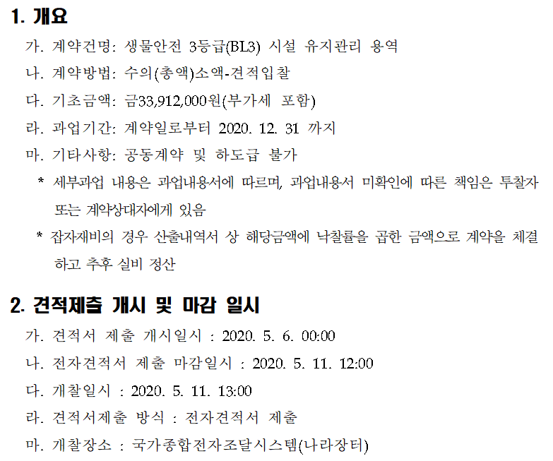 [나라장터] 생물안전 3등급(BL3) 시설 유지관리 용역 (05.06~05.11) 작성자 최고관리자 조회 232 작성일 2020-05-06 안녕하세요. 한국생물안전협회입니다. 보건복지부 질병관리본부 국립인청공항검역소 공고 제2020-1호 생물안전 3등급(BL3) 시설 유지관리 용역 공고를 안내드립니다. 감사합니다. 나라장터 바로가기 이전글 다음글 목록