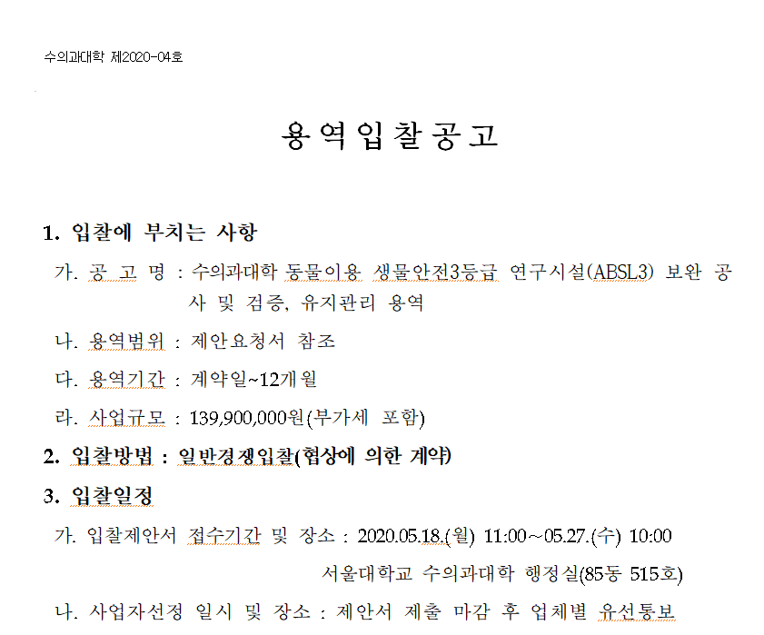 서울대학교 수의과대학 동물이용 생물안전3등급(ABL3) 연구시설 보완공사, 검증 및 유지보수용역 공고를 안내드립니다.