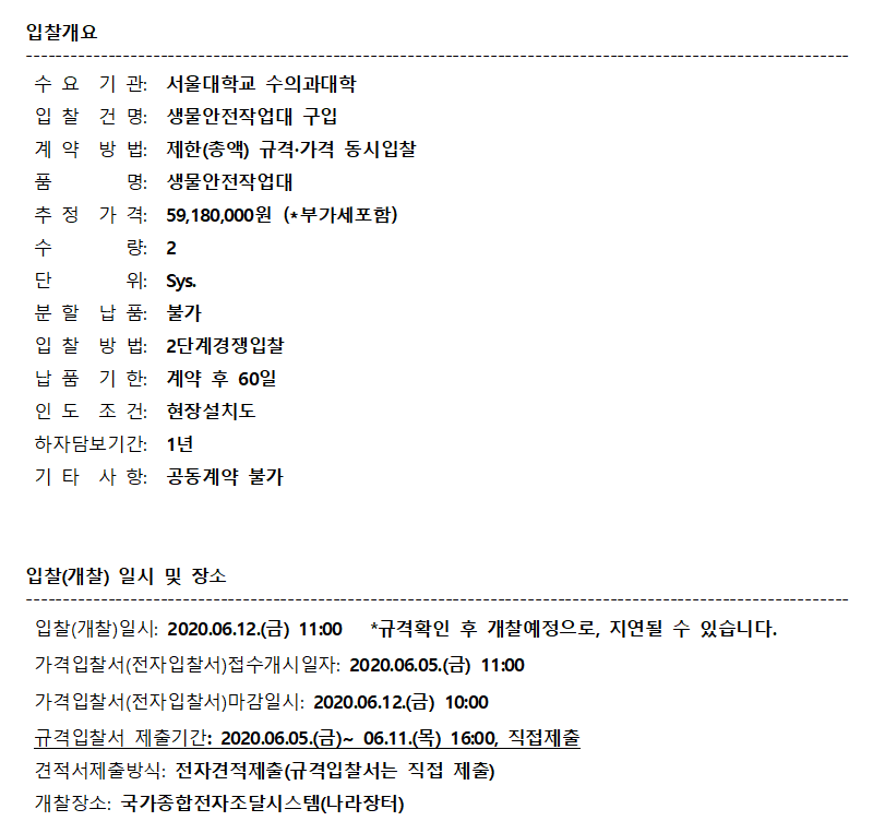 [나라장터] 서울대학교 수의과대학 생물안전작업대 구매 입찰공고(~6.11) 작성자 최고관리자 조회 227 작성일 2020-06-08 안녕하세요. 한국생물안전협회입니다. 서울대학교 수의과대학 생물안전작업대 구매 입찰공고를 안내드립니다. [나라장터 바로가기] 감사합니다. 이전글 다음글 목록