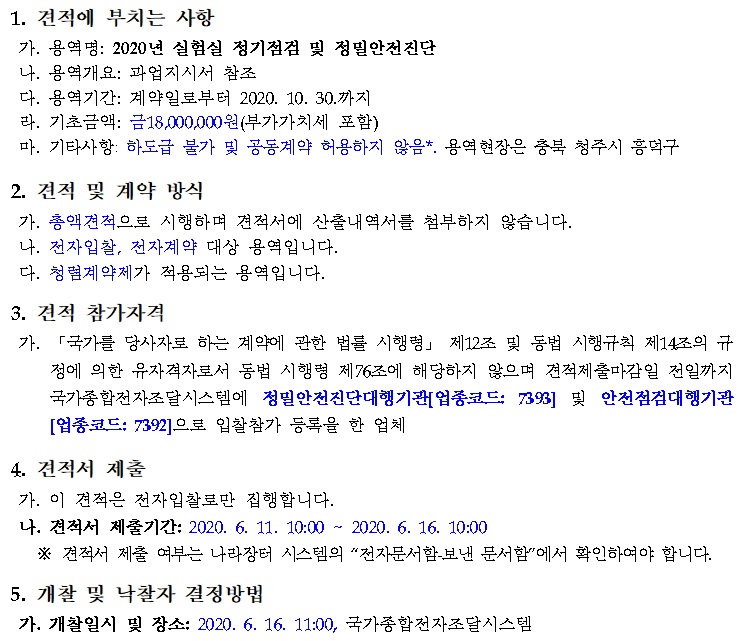 [나라장터] 2020년 실험실 정기점검 및 정밀안전진단(06.11~06.16) 작성자 최고관리자 조회 216 작성일 2020-06-10 안녕하세요. 한국생물안전협회입니다. 질병관리본부 공고 '2020년 실험실 정기점검 및 정밀안전진단' 용역을 안내드립니다. [나라장터 바로가기] 감사합니다. 이전글 다음글 목록