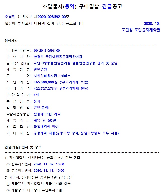[나라장터] 국립야생동물질병관리원 생물안전연구동 관리 및 운영 긴급공고(~11.11) 작성자 최고관리자 조회 286 작성일 2020-11-03 안녕하세요. 한국생물안전협회입니다. 국립야생동물질병관리원 생물안전연구동 유지관리 공고를 안내드립니다. [나라장터 바로가기] 감사합니다. 이전글 다음글 목록