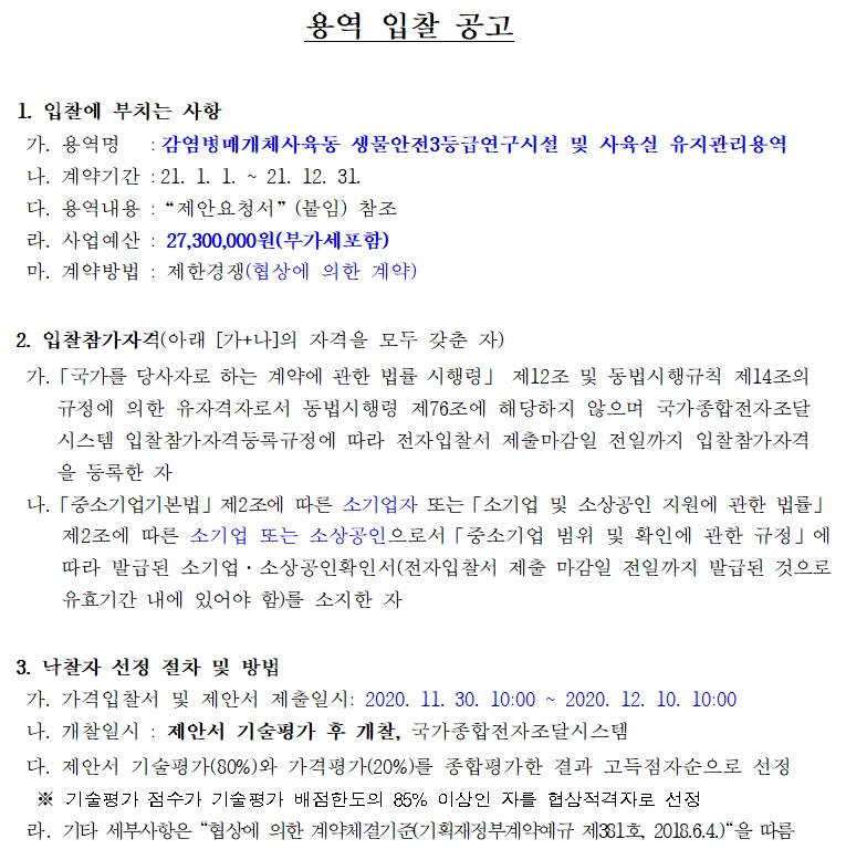 [나라장터] 감염병매개체사육동 생물안전3등급연구시설 및 사육실 유지관리용역 (~12.10) 작성자 최고관리자 조회 326 작성일 2020-11-30 안녕하세요. 한국생물안전협회입니다. 질병관리청 공고 감염병매개체사육동 생물안전 3등급 연구시설 및 사육실 유지관리용역을 안내드립니다. [나라장터 바로가기] 감사합니다. 이전글 다음글 목록
