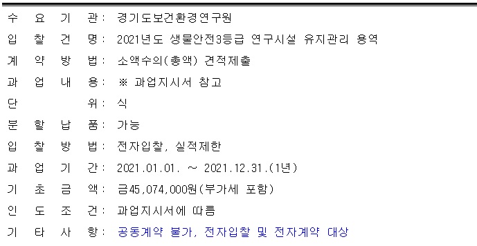 [나라장터] 2021년 생물안전 3등급 연구시설 유지관리 용역 (~12.09) 작성자 최고관리자 조회 337 작성일 2020-12-07 안녕하세요. 한국생물안전협회입니다. 경기도보건환경연구원 2021년 생물안전 3등급 연구시설 유지관리 용역 공고를 안내드립니다. 자세한 사항은 링크[바로가기]를 확인 바랍니다. 감사합니다. 이전글 다음글 목록