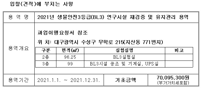 [나라장터] 대구 보환연, 2021년 생물안전3등급(BL3) 연구시설 재검증 및 유지관리 용역 (~ 12.11) 작성자 최고관리자 조회 364 작성일 2020-12-08 안녕하세요. 한국생물안전협회입니다. 대구광역시 보건환경연구원 2021년 생물안전3등급(BL3) 연구시설 재검증 및 유지관리 용역 공고를 안내드립니다. 자세한 사항은 링크[바로가기]에서 확인 바랍니다. 감사합니다. 이전글 다음글 목록