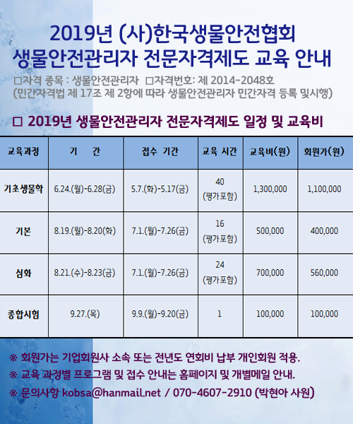 2019년 '생물안전관리자' 전문자격제도 교육을 첨부와 같이 공지하오니 업무 참조 바랍니다.