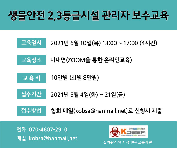 [교육공지] 생물안전 2,3등급시설 관리자 보수교육(6.10) 안내 (~5.21)