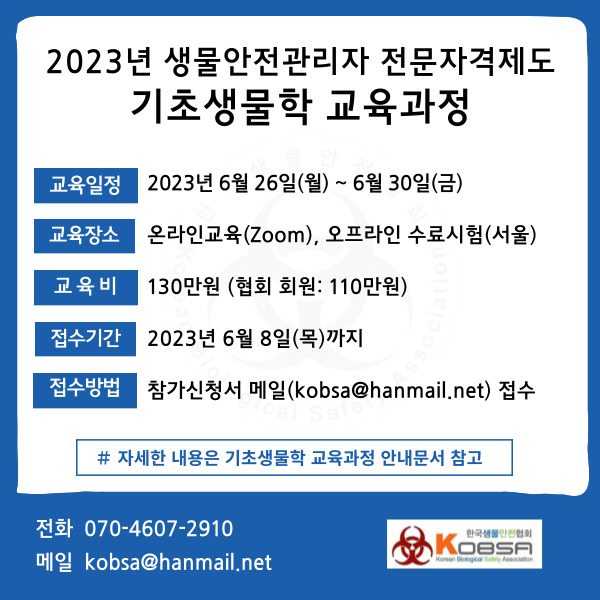 2023년 생물안전관리자 전문자격제도 기초생물학 교육과정(~6.8까지 접수)
