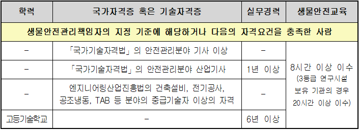 1. 연구시설 등급에 따른 생물안전 관계자의 교육요건