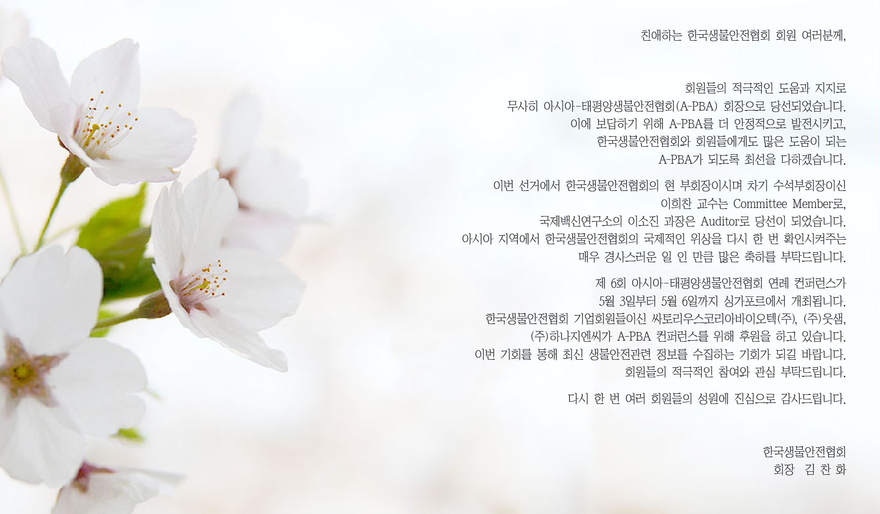 A-PBA 회장 당선 공지. 작성자 KOBSA 조회 3,662 작성일 2011-04-06 한국생물안전협회 김찬화 회장님께서 아시아-태평양생물안전협회(A-PBA) 회장으로 당선되셨습니다. 이전글 다음글 목록