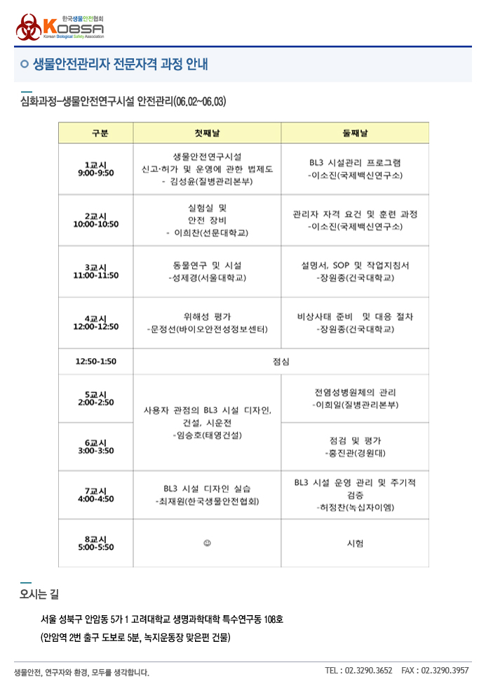 [생물안전관리자 전문자격 - 생물안전연구시설 안전관리] 세부일정 안내. 작성자 KOBSA 조회 4,544 작성일 2011-05-24 돌아오는 6월 2일(목)부터 3일(금)까지 진행되는[생물안전관리자 전문자격-생물안전연구시설 안전관리] 세부일정을 알려드립니다. 오시는 길은 첨부파일을 확인해 주시기 바랍니다. 첨부파일 오시는 길(특수동).hwp 이전글 다음글 목록