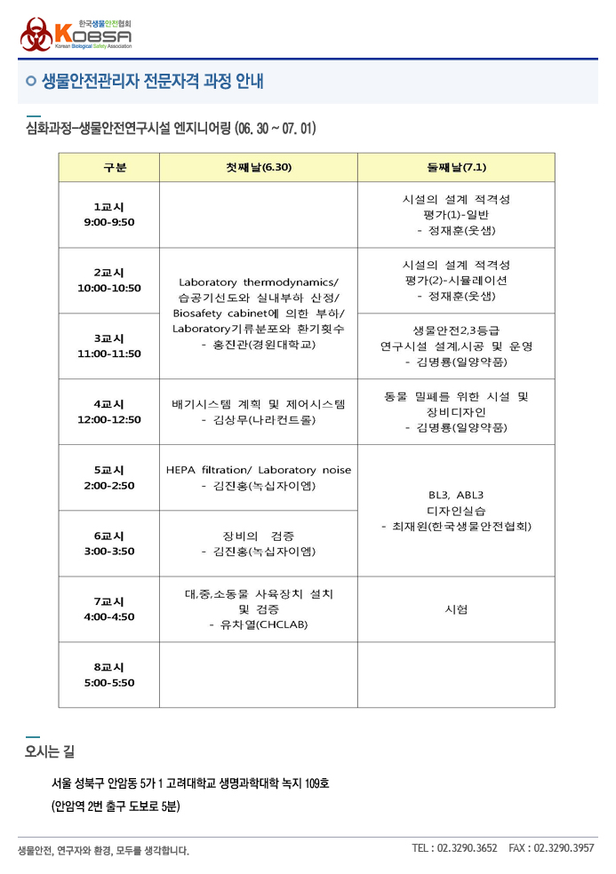[생물안전관리자 전문자격- 생물안전연구시설 엔지니어링] 세부일정 작성자 KOBSA 조회 3,711 작성일 2011-06-14 돌아오는 6월 30일부터 7월 1일까지 있는 생물안전연구시설 엔지니어링 교육 시간표를 안내드립니다.오시는 길은 첨부파일 참고하시기 바랍니다. 첨부파일 오시는 길(녹지관).hwp심화교육과정2.pdf 이전글 다음글 목록
