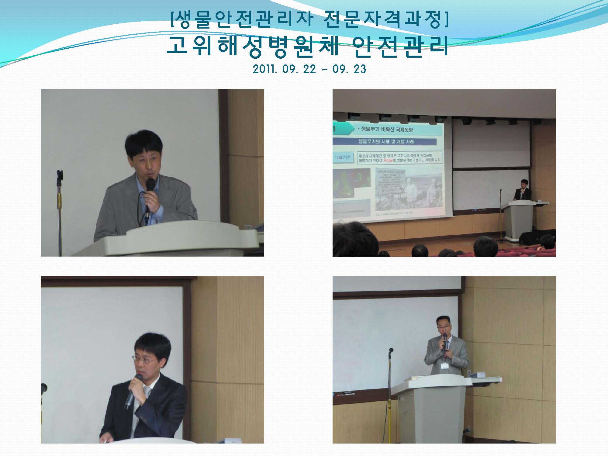 [생물안전관리자 전문자격 : 고위해성병원체 안전관리] 사진 작성자 KOBSA 조회 6,509 작성일 2011-11-23 2011년 9월 22일(목)부터 23일(금)까지 고려대학교 생명과학대학에서 개최되었던 [생물안전관리자 전문자격 : 고위해성병원체 안전관리] 사진입니다. 이전글 다음글 목록