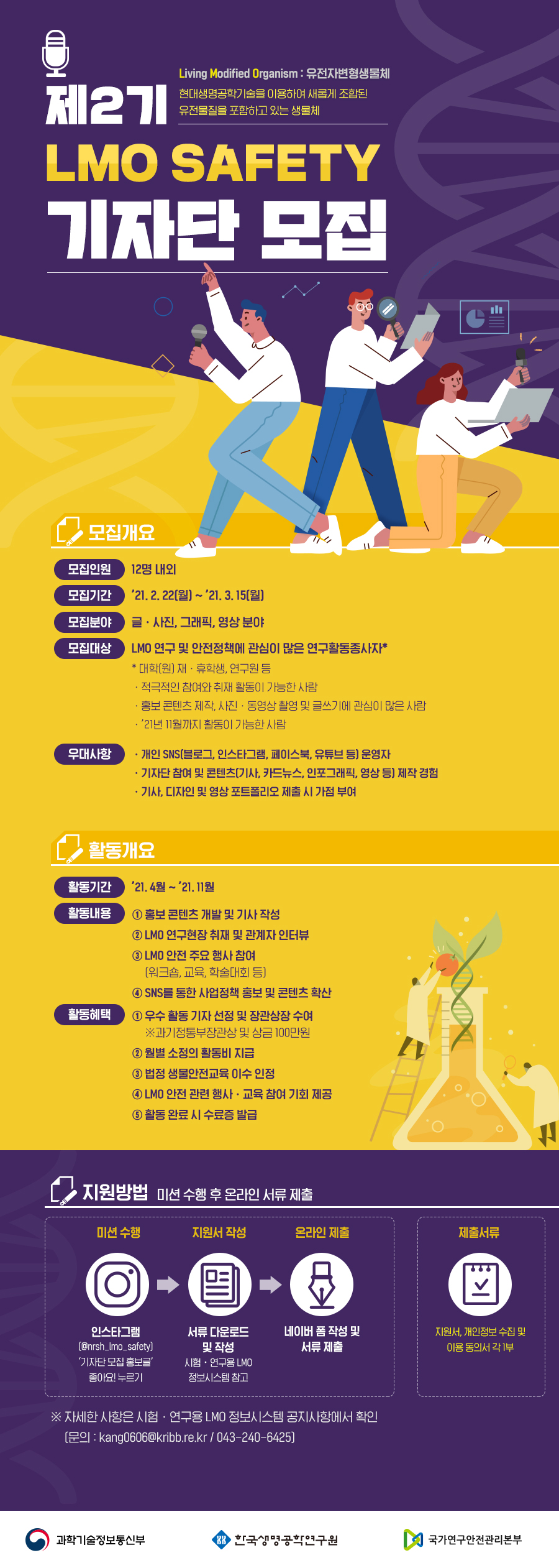 [홍보]국가연구안전관리본부 제2기 LMO SAFETY 기자단 모집 안내 작성자 최고관리자 조회 1,533 작성일 2021-02-26 첨부파일 2021년 「제2기 LMO SAFETY 기자단」 모집 공고.hwp 이전글 다음글 목록