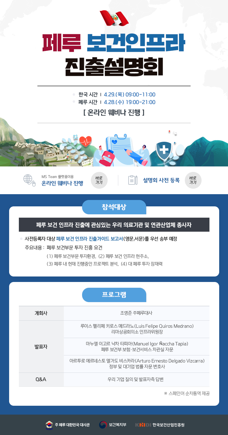 한국보건산업진흥원, 페루 보건인프라 진출설명회 웨비나 진행(4.29) 작성자 최고관리자 조회 1,539 작성일 2021-04-21 안녕하세요. 한국생물안전협회입니다. 페루 보건인프라 진출설명회를 안내드립니다. 사전등록 접수 링크 바로가기 웨비나 접속 링크 바로가기 감사합니다. 이전글 다음글 목록