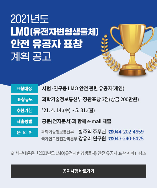 국가연구안전관리본부, 2021년도 LMO(유전자변형생물체) 안전 유공자 표창 계획 공고(~7.2까지 연장)