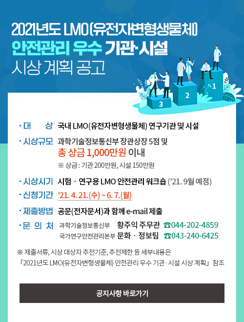 국가연구안전관리본부, 2021년도 LMO 안전관리 우수 기관·시설 시상 계획 공고