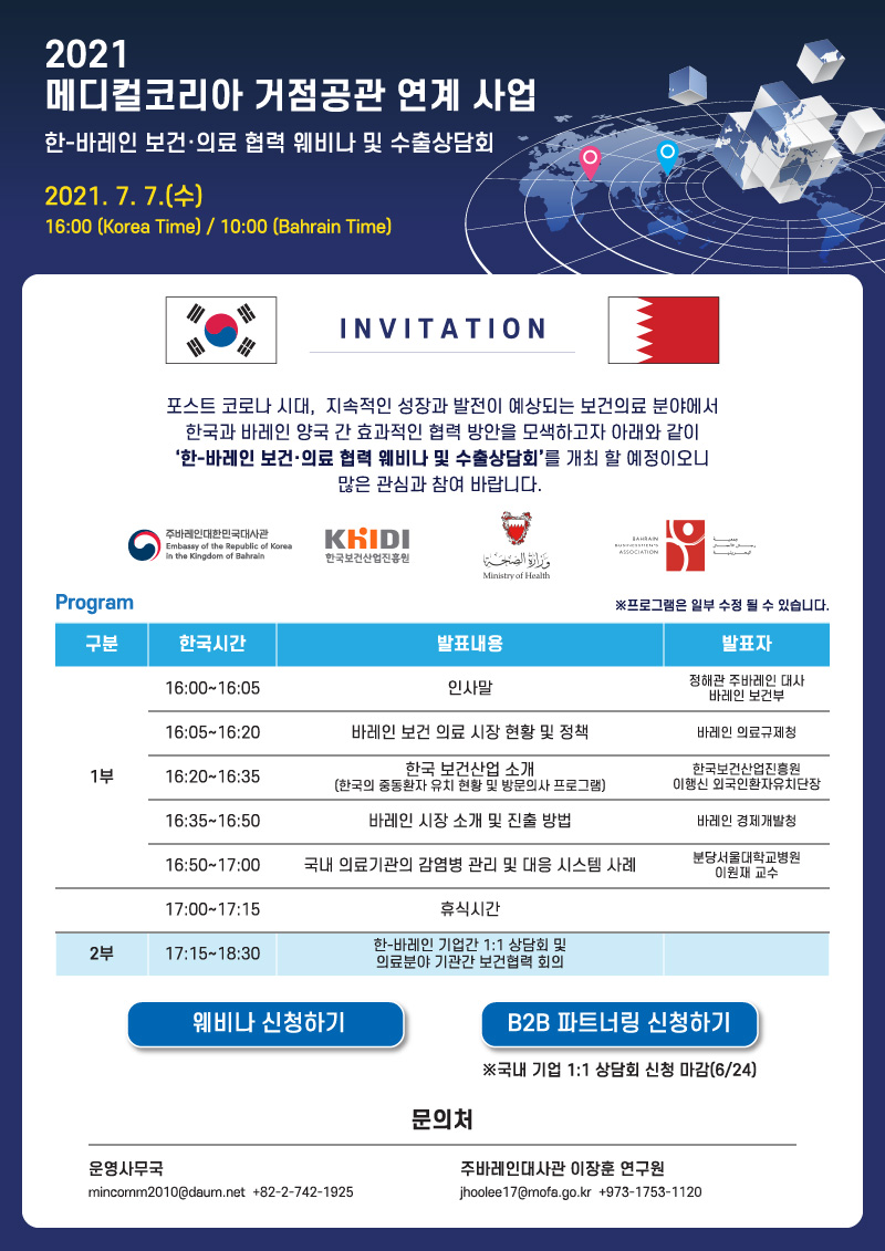 한-바레인 보건의료 협력 웨비나 및 수출상담회 개최 안내(7.7)