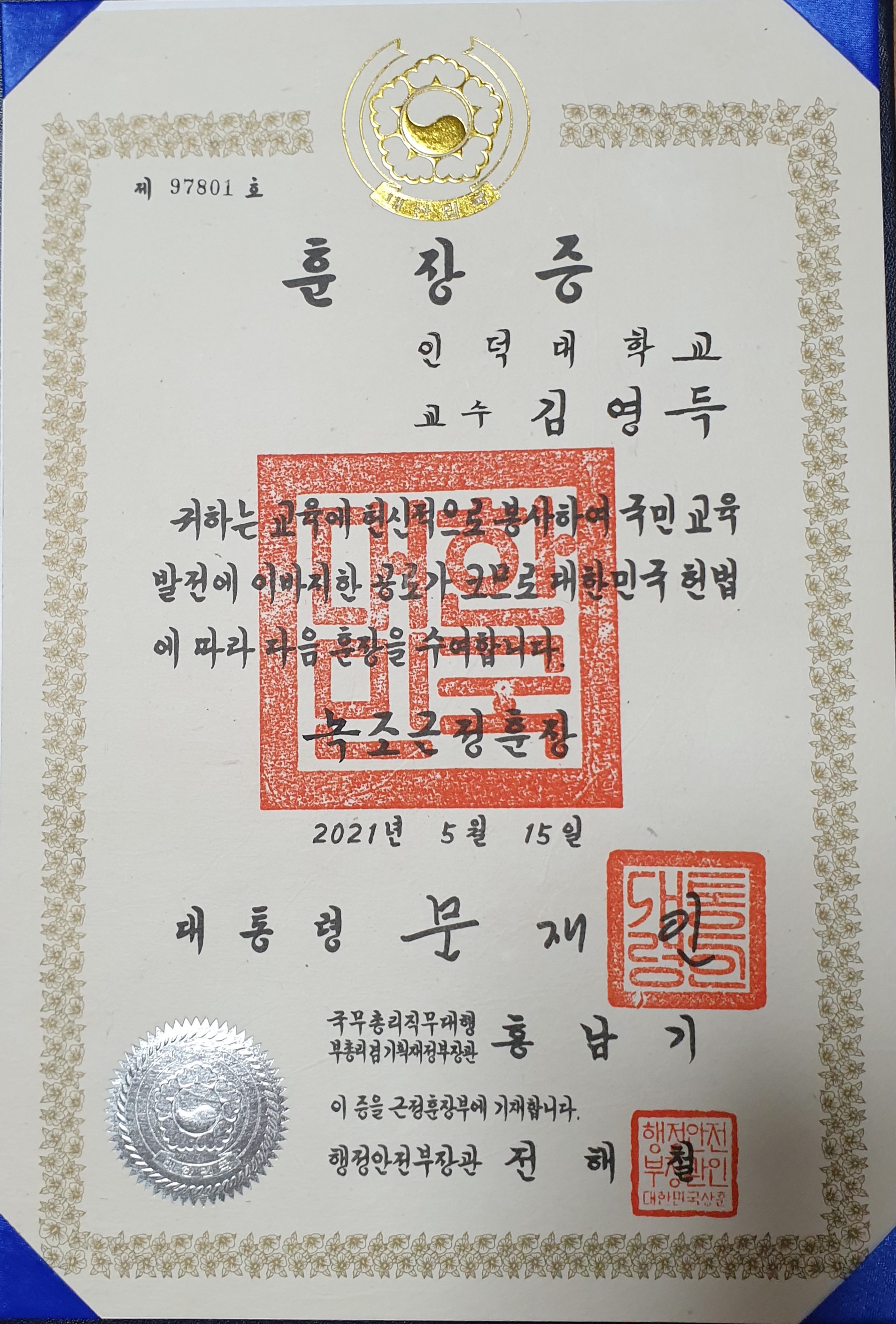 김영득 협회장, 훈장증 수훈 작성자 홈페이지 관리자 조회 1,369 작성일 2021-07-28 안녕하세요. 한국생물안전협회입니다. 사단법인 한국생물안전협회 김영득 협회장님께서 국민 교육 발전에 이바지한 공로로 훈장증을 수여받았습니다. 이전글 다음글 목록