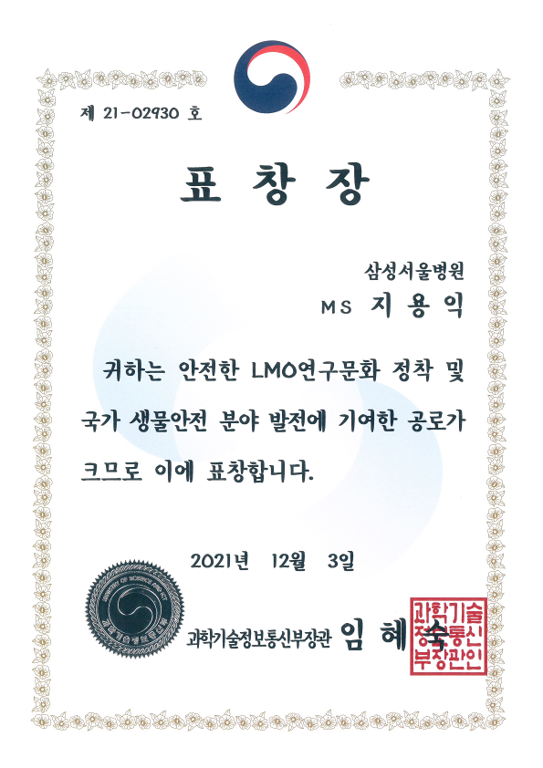 지용익 협회 이사(삼성서울병원 MS), 2021년도 LMO 안전 유공자 선정 및 과학기술정보통신부장관 표창 수상 (12.3)