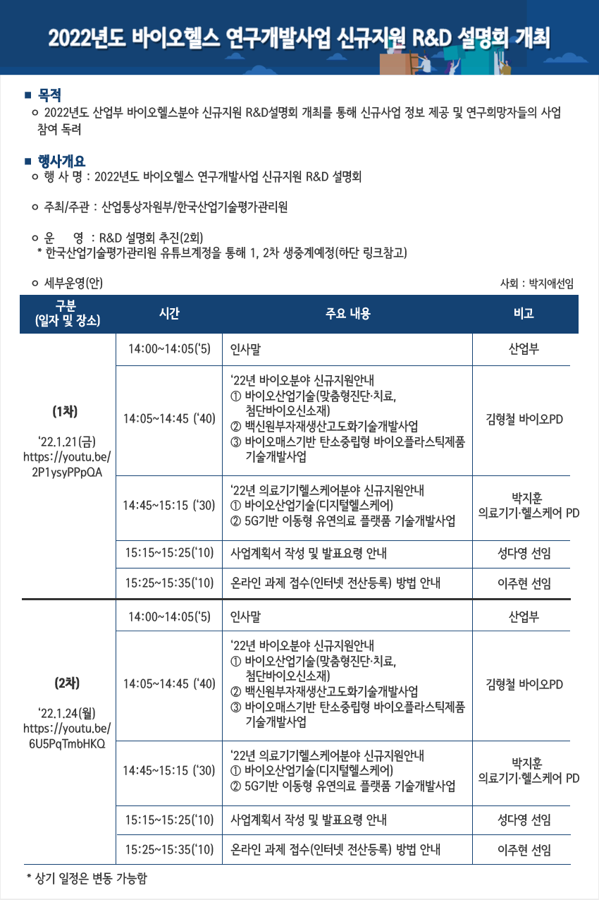 [KEIT 행사(이벤트)] 2022년도 바이오헬스 연구개발사업 신규지원 R&D 설명회 개최 작성자 홈페이지 관리자 조회 1,190 작성일 2022-01-21 바로가기 링크 : 한국산업기술평가관리원(KEIT) 유튜브 이전글 다음글 목록