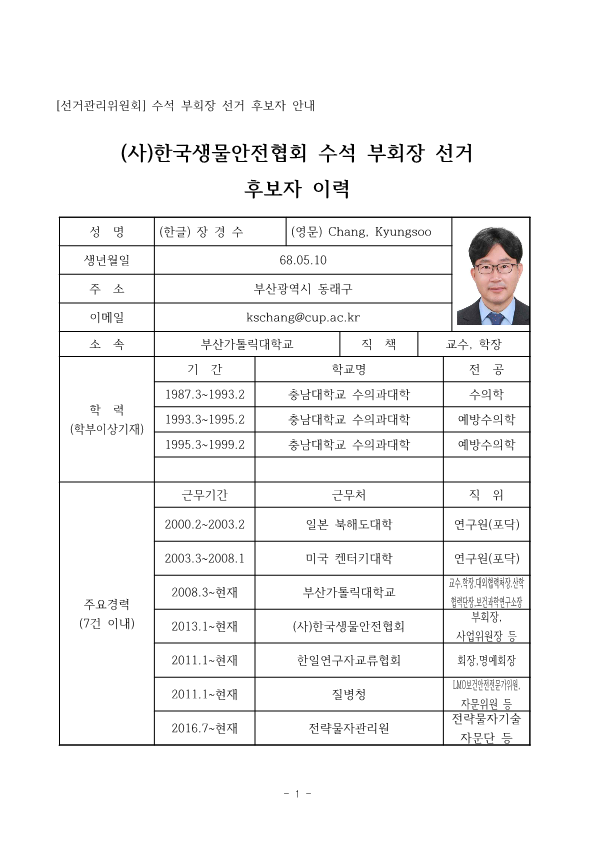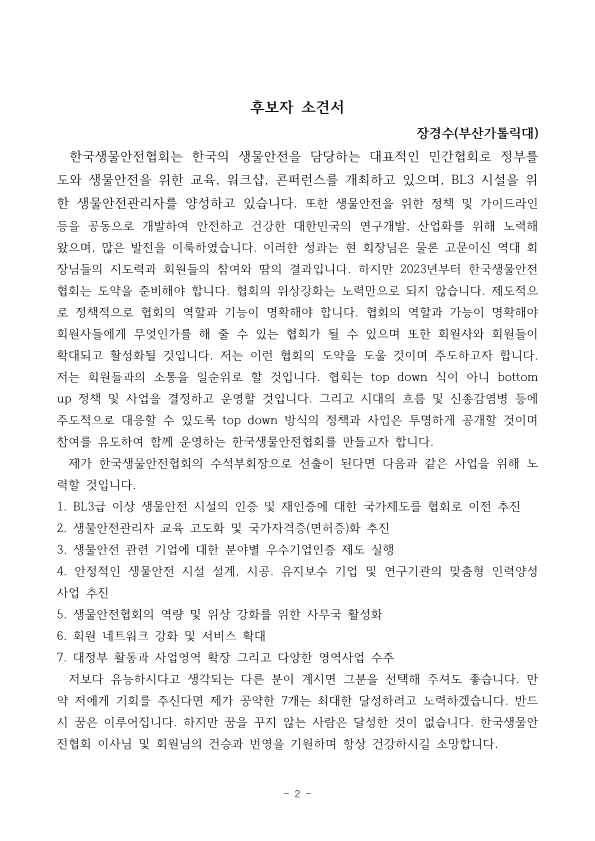 사단법인 한국생물안전협회 2023년도 임원 선출을 위한 선거관리위원회는 선거규정에 따라 수석 부회장 선거 후보를 다음과 같이 공고합니다.
