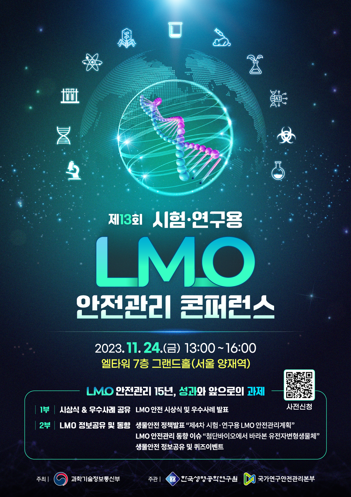 제13회 시험·연구용 유전자변형생물체 안전관리 콘퍼런스 개최(11.24) 작성자 홈페이지 관리자 조회 1,502 작성일 2023-11-16 콘퍼런스 참가신청 바로가기(하단 링크 클릭) https://www.lmosafety.or.kr/mps/competition/intro/53 첨부파일 「제13회 시험·연구용 유전자변형생물체 안전관리 콘퍼런스」개최 알림 및 참석협조 요청.pdf[붙임1] 제13회 시험·연구용 LMO 안전관리 콘퍼런스 개최 계획(안).hwpx 이전글 다음글 목록