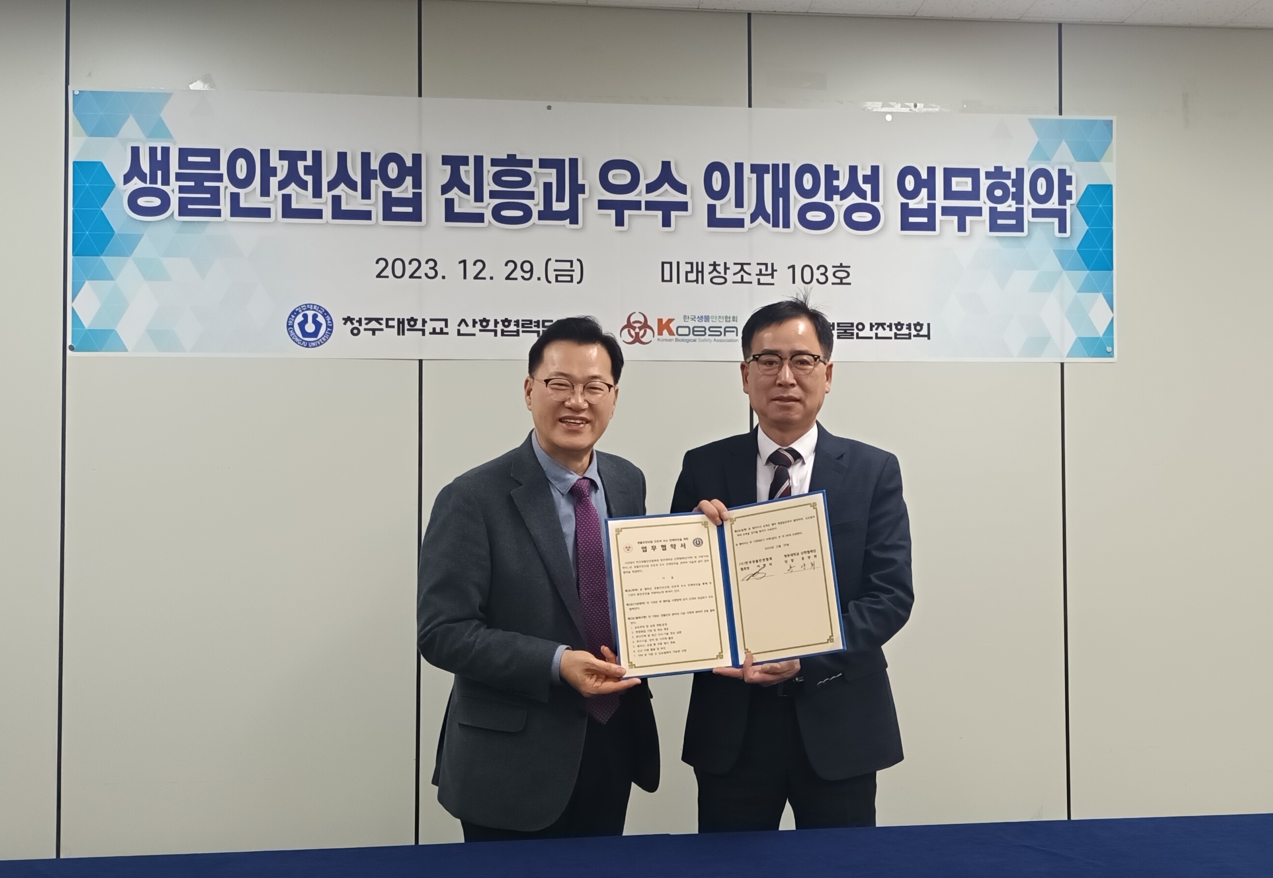 (사)한국생물안전협회(회장 이명식)는 청주대학교(총장 김윤배) 산학협력단과 ‘생물안전산업 진흥과 우수 인재양성 위한 업무협약’ 체결식을 29일 오후 청주대학교 미래창조관에서 진행하였다.