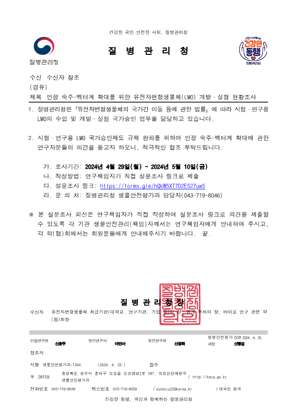 [질병관리청] 인정 숙주-벡터계 확대를 위한 유전자변형생물체(LMO) 개발·실험 현황조사(~5.10) 작성자 홈페이지 관리자 조회 1,258 작성일 2024-04-25 설문조사링크 : https://forms.gle/hQkW5XT7D2E527uw5 첨부파일 [본문] 인정 숙주-벡터계 확대를 위한 유전자변형생물체(LMO) 개발·실험 현황조사.pdf 이전글 다음글 목록