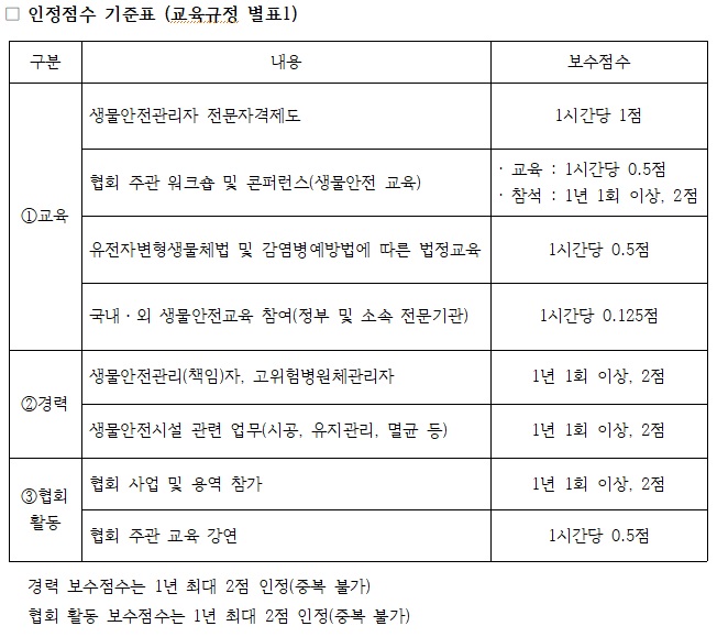 - 교육규정 10조 2항에 따라 보수점수 20점 중 4점 이상은 반드시 협회 교육을 이수함으로 취득하여야 한다.