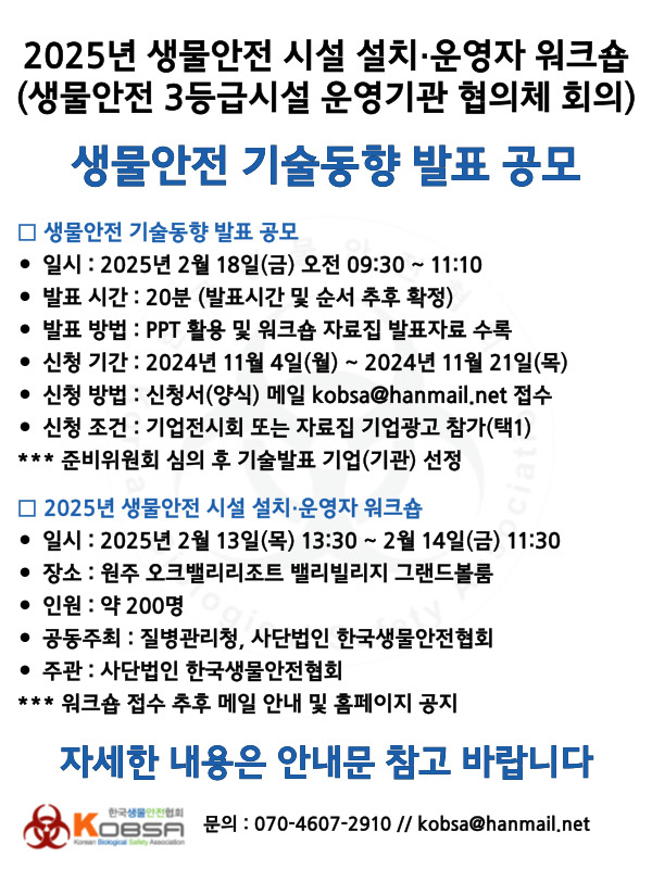 2025년 생물안전 시설 설치,운영자 워크숍 기술동향 발표 공모(~11.21)