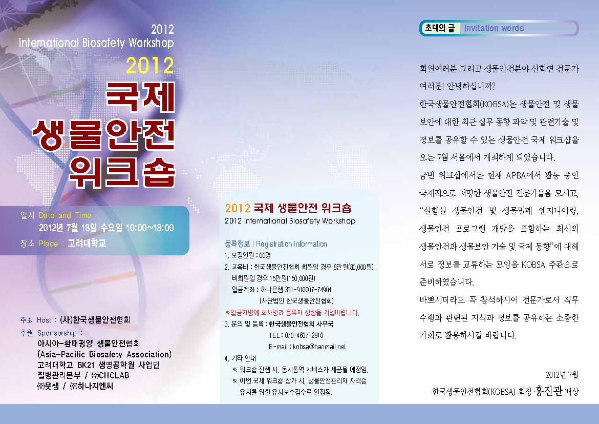 2012 한국생물안전협회 국제 생물안전 워크숍 안내