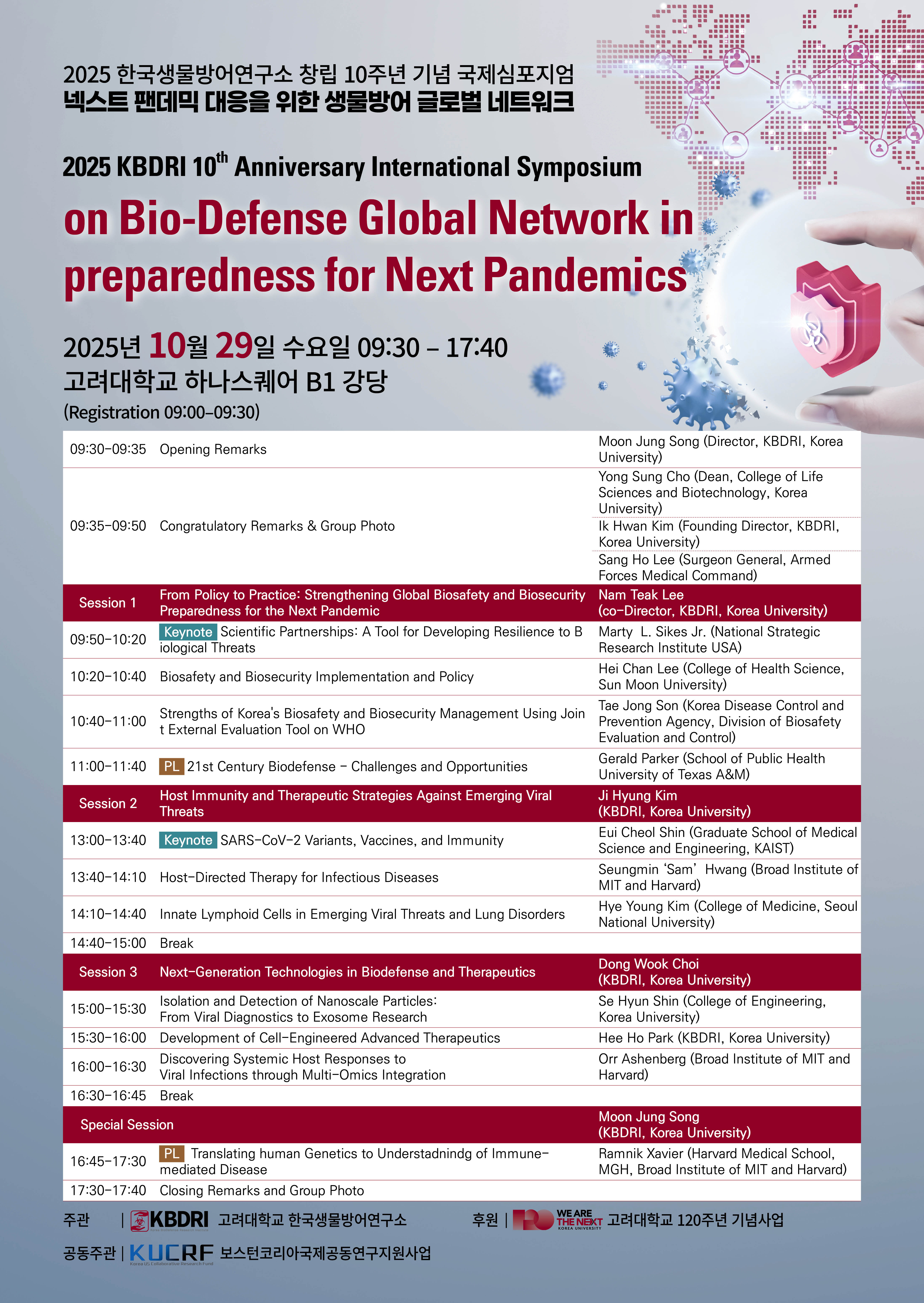 고려대학교 한국생물방어연구소(KBDRI) 창립 10주년 기념 국제심포지엄 개최(10.29) 작성자 홈페이지 관리자 조회 420 작성일 2025-10-15 첨부파일 고려대학교 한국생물방어연구소(KBDRI) 국제심포지엄 개최(공문).pdf 이전글 다음글 목록