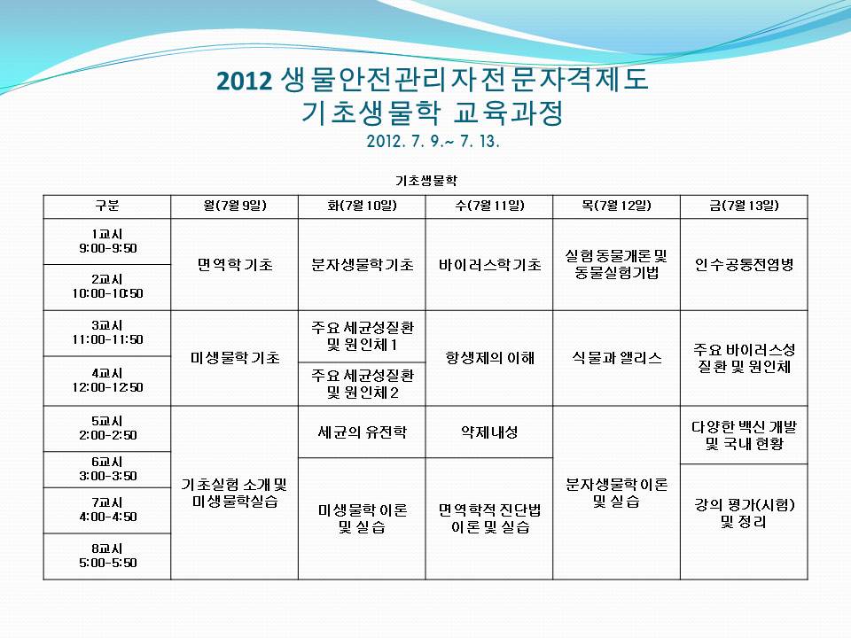 [KOBSA] 2012년 기초생물학 교육과정 시간표(7.9~7.13) 작성자 KOBSA 조회 3,016 작성일 2012-06-28 * 일정은 변경될 수 있습니다. 이전글 다음글 목록