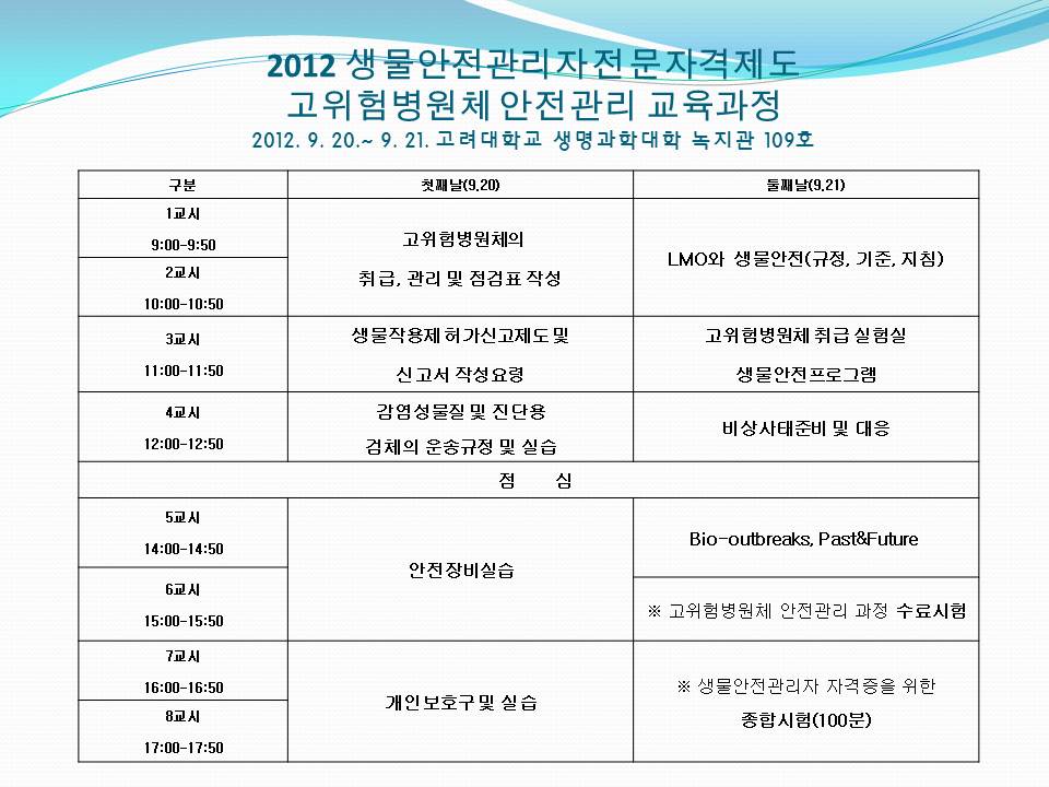 [KOBSA] 2012 고위험병원체 안전관리 교육과정 시간표(9.20~9.21) 작성자 KOBSA 조회 3,417 작성일 2012-08-30 * 일정은 협회 사정에 따라 변경될 수 있습니다. 첨부파일 시간표.jpg 이전글 다음글 목록