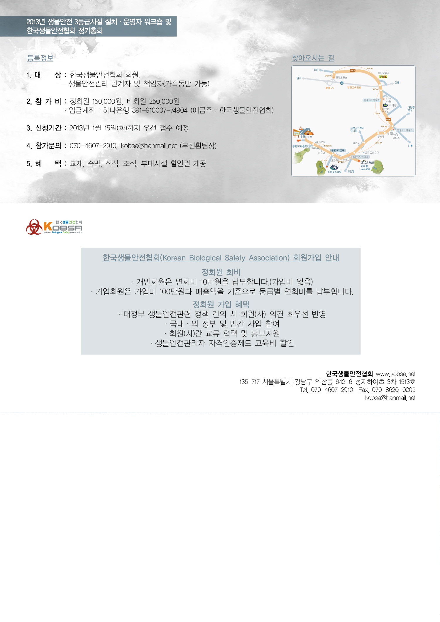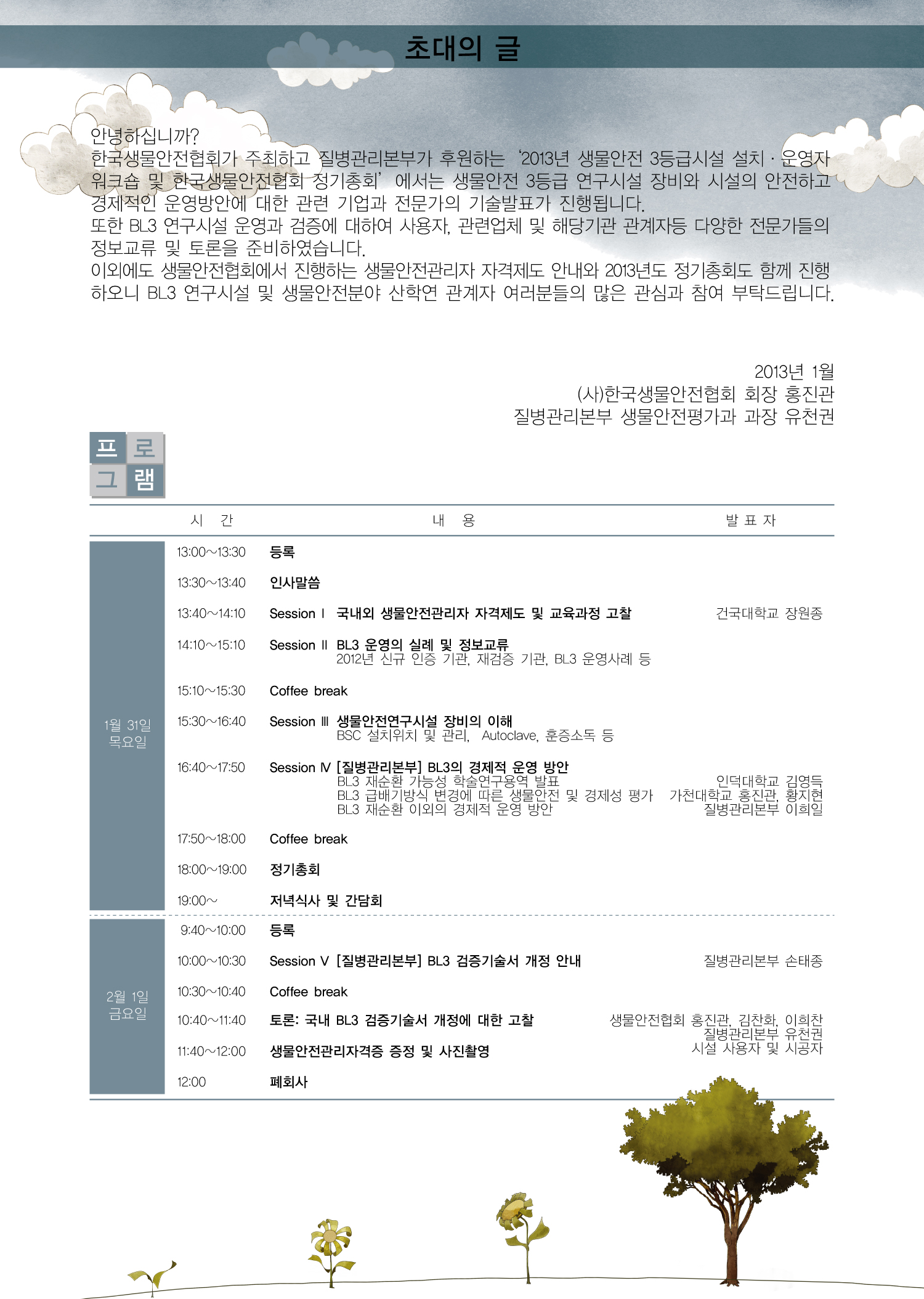 2013년 1월 31일 - 2월 1일(1박2일), 강원도 용평리조트<BR>2013년 생물안전 3등급시설 설치,운영자 워크숍 및 한국생물안전협회 정기총회<BR>주최 : 한국생물안전협회<BR>후원 : 질병관리본부<BR><BR><IMG border=0 alt="" align=top src="/board/upload/olddata/cheditor4/1301/QBfE6wqYhnKyq.jpg" width=1500 height=2108>