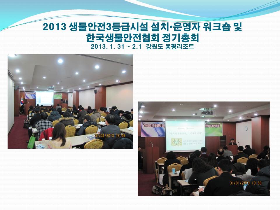 [KOBSA] 2013년 한국생물안전협회 정기총회 및 워크숍(1.31~2.1) 사진 작성자 KOBSA 조회 3,642 작성일 2013-02-18 2013년 강원도 용평리조트에서 진행되었던 한국생물안전협회 워크숍 및 정기총회 실제 사진입니다. 이전글 다음글 목록